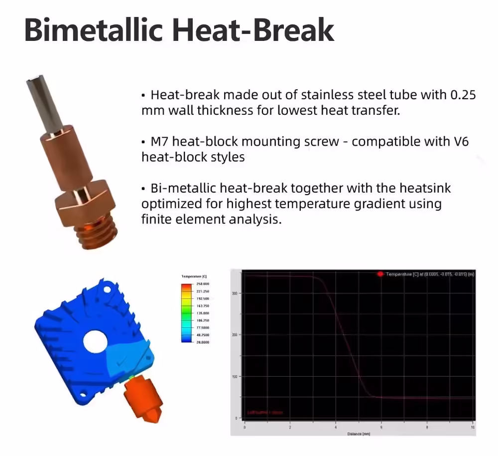 Zaawansowany system napędu z przekładnią planetarną i powłoką RNC zapewnia doskonałą siłę ekstruzji oraz niezrównaną precyzję, umożliwiając stabilną i wydajną pracę przy wysokich prędkościach. Bi-Metal Heatbreak z ekstremalnym gradientem temperatur gwarantuje efektywne zarządzanie ciepłem, eliminując ryzyko zatorów i zapewniając niezawodność w druku z materiałami wymagającymi wysokiej temperatury.