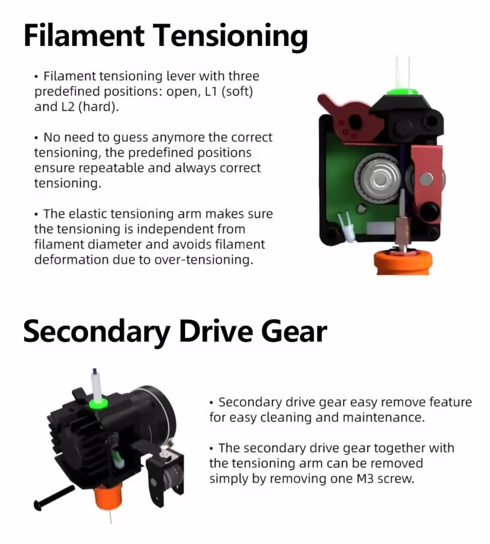Unikalny mechanizm napinania z predefiniowanymi poziomami napięcia zapewnia płynne podawanie filamentu, minimalizując ryzyko zacięć. Dodatkowo, system demontażu koła napędowego ułatwia czyszczenie i konserwację, wydłużając żywotność urządzenia. Ekstruder wyposażono w wentylator bez ramy, który zmniejsza wagę, a jednocześnie zapewnia skuteczne chłodzenie, poprawiając jakość wydruku i utrzymując optymalną temperaturę filamentu.