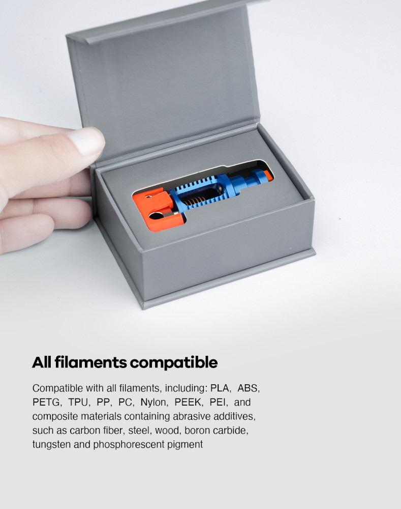 Poznaj zaawansowany, całkowicie metalowy hotend, który łączy wysoką wydajność z wyjątkową precyzją druku 3D. Dzięki możliwości pracy w temperaturach dochodzących do 500 °C, Dragon Standard Flow umożliwia obróbkę praktycznie każdego filamentu – od PLA, ABS czy PETG, po bardziej wymagające materiały techniczne, takie jak nylon czy PC.