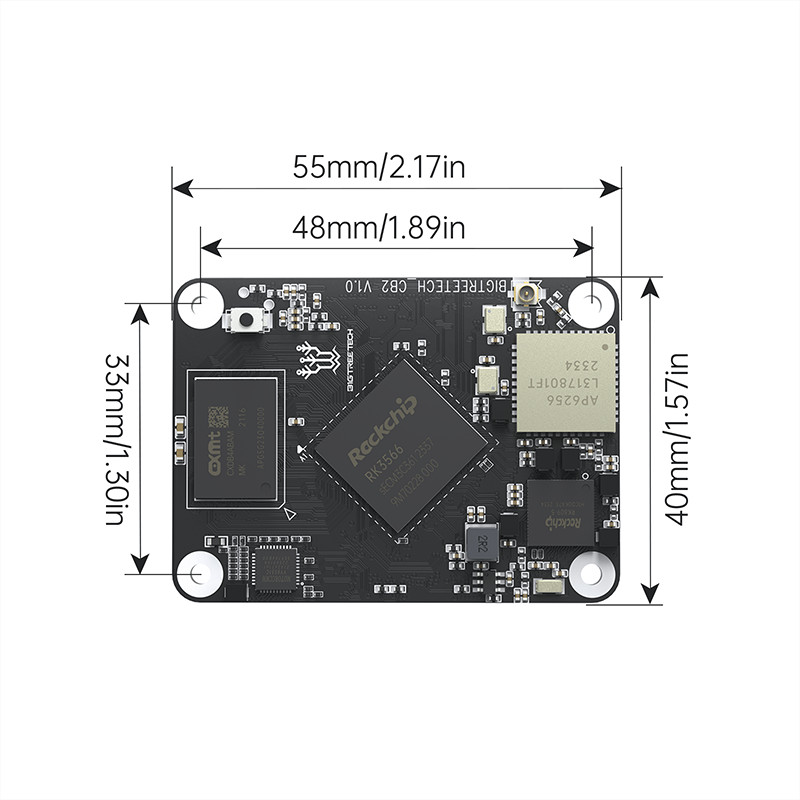Sercem CB2 V1.0 jest czterordzeniowy procesor Rockchip RK3566 ARM Cortex-A55 o taktowaniu 1,8 GHz, wspierany przez 2 GB pamięci RAM LPDDR4 oraz 32 GB pamięci eMMC. Moduł posiada również układ graficzny Mali-G52 2EE z obsługą OpenGL ES 3.2, co pozwala na wyświetlanie obrazu w wysokiej jakości. Dodatkowo obsługuje wyjście Micro HDMI z możliwością wyświetlania treści w rozdzielczości 4K, co czyni go uniwersalnym rozwiązaniem dla różnych zastosowań multimedialnych.