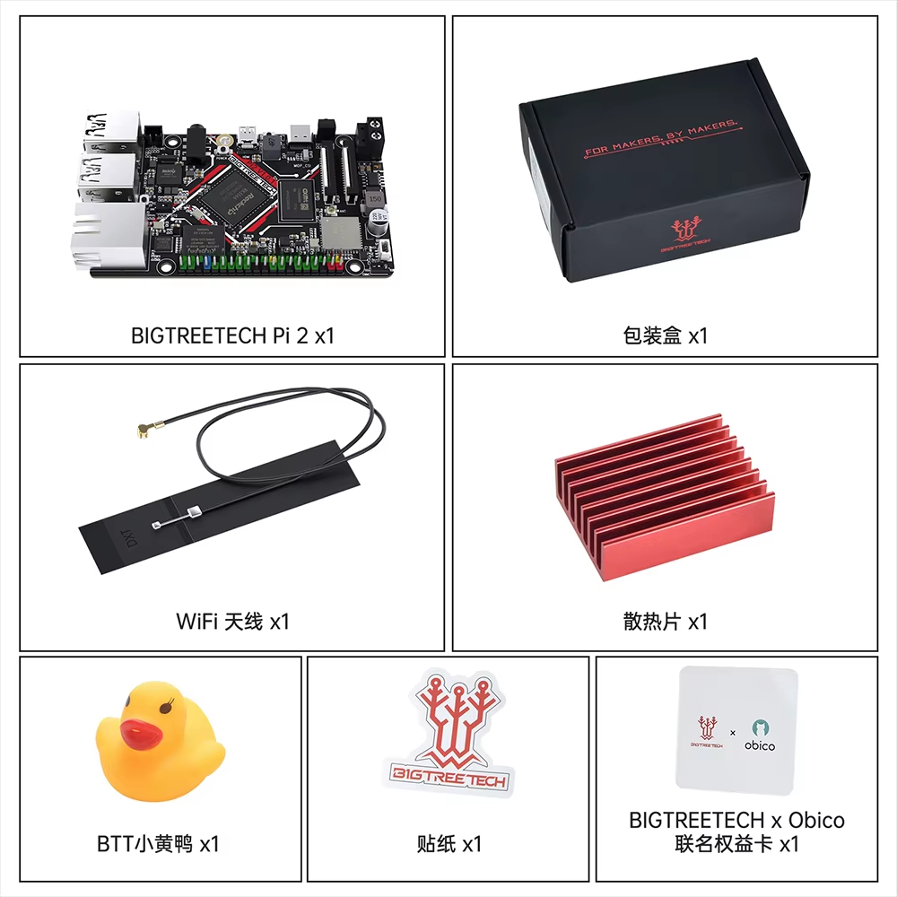 Płyta ma wymiary 93,8 x 56 mm i rozmieszczenie otworów montażowych zgodne z Raspberry Pi, co ułatwia jej instalację w istniejących obudowach i systemach. W zestawie znajduje się antena Wi-Fi, radiator, naklejka oraz figurka BTT Duck. Warto zauważyć, że BIGTREETECH Pi 2 nie posiada natywnego interfejsu SPI; w przypadku potrzeby podłączenia wyświetlacza SPI, należy skorzystać z dodatkowych modułów, takich jak IO2 CAN, EBB lub U2C.