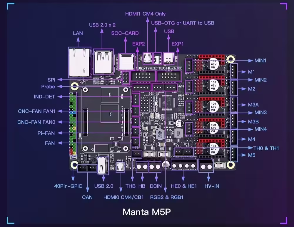 Jednym z kluczowych atutów Manta M5P jest możliwość bezpośredniej instalacji modułów takich jak BIGTREETECH CB1 czy Raspberry Pi Compute Module 4 (CM4) dzięki zastosowaniu złączy Board-to-Board (BTB). Eliminuje to konieczność stosowania dodatkowego okablowania, upraszczając konfigurację systemu i oszczędzając miejsce w obudowie.