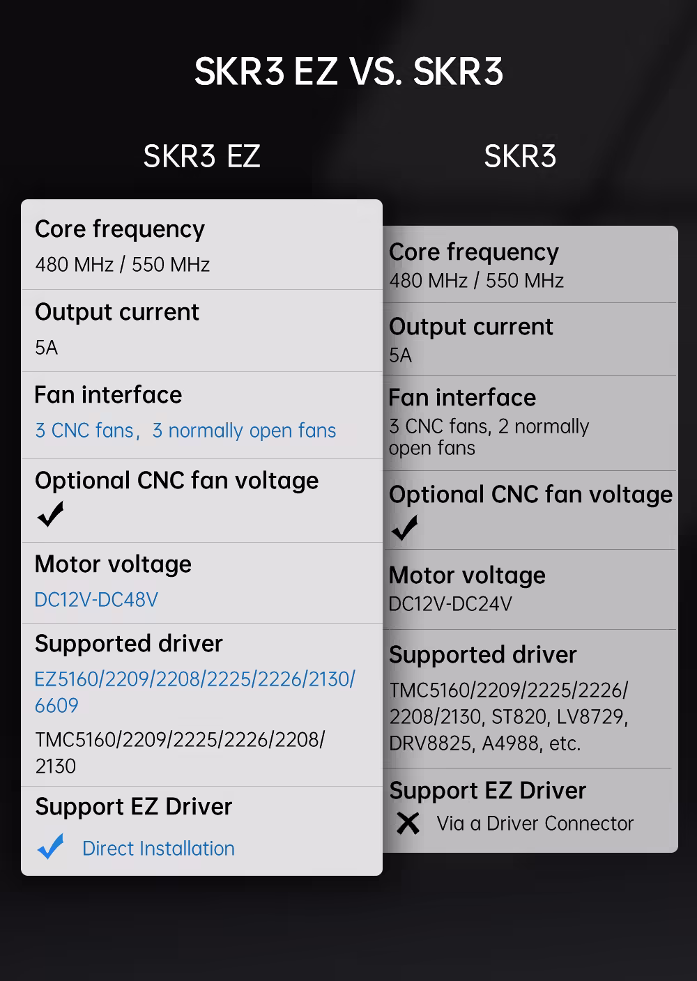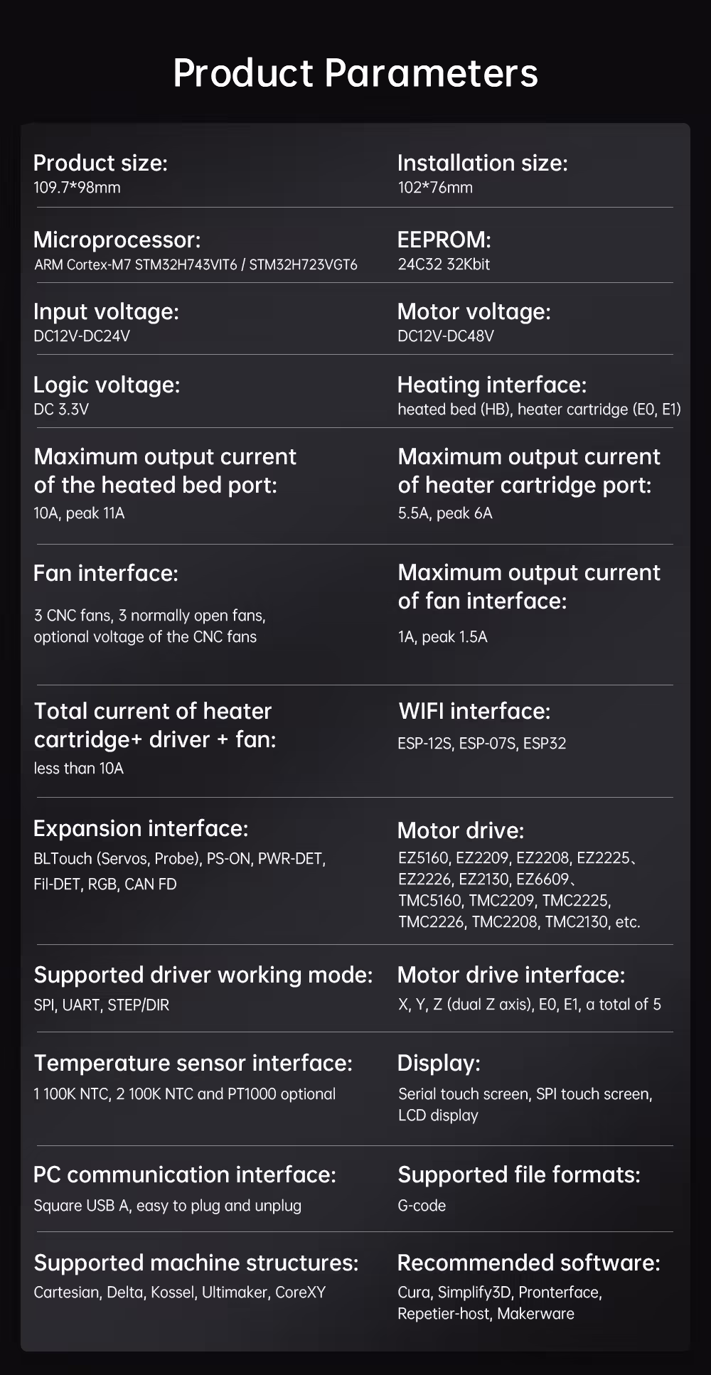 | Obsługiwane sterowniki silników krokowych | EZ5160, EZ2209, EZ2208, EZ2225, EZ2226, EZ2130, EZ6609, TMC5160, TMC2209, TMC2225, TMC2226, TMC2208, TMC2130, itd. |
