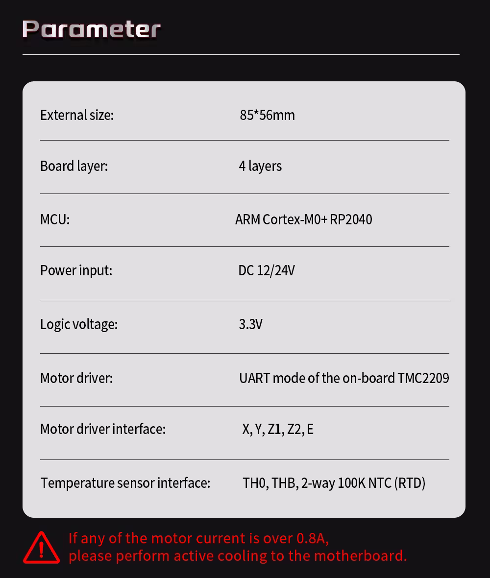 Płyta wyposażona jest w procesor ARM Cortex-M0+ RP2040, wspierany przez 2 MB zewnętrznej pamięci flash, co pozwala na szybkie przetwarzanie danych i stabilne działanie. SKR Pico V1.0 została opracowana z myślą o pracy z firmware Klipper, co umożliwia zaawansowane sterowanie drukarką 3D i precyzyjną konfigurację. Dzięki dedykowanemu portowi USB-C, zapewniono nowoczesną i wygodną formę komunikacji z urządzeniami zewnętrznymi.