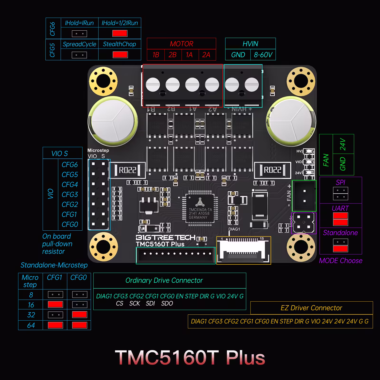 BIGTREETECH TMC5160T Plus V1.0 to wysokowydajny sterownik silnika krokowego zaprojektowany do precyzyjnego i cichego sterowania w aplikacjach takich jak drukarki 3D, maszyny CNC oraz systemy automatyki przemysłowej. Wersja Plus została wyposażona w solidną metalową obudowę i radiator, które zapewniają efektywne odprowadzanie ciepła, zwiększając trwałość i niezawodność w wymagających warunkach pracy. Dzięki obsłudze napięcia zasilania od 8V do 60V oraz maksymalnemu prądowi szczytowemu do 15A, sterownik ten może napędzać silniki krokowe o wysokiej mocy i precyzji.