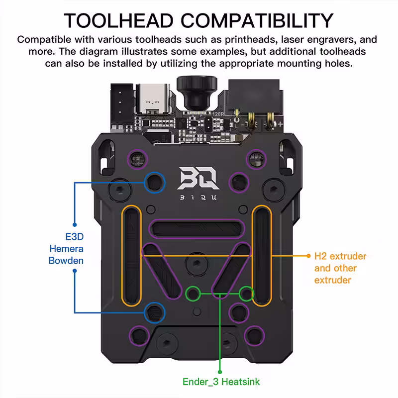 Kompatybilny z szeroką gamą popularnych głowic drukujących, takich jak H2, E3D Hemera, a także z narzędziami dodatkowymi, jak lasery czy plottery. Możliwość łatwego podłączenia różnych urządzeń sprawia, że zestaw ten idealnie sprawdza się w wielu różnych zastosowaniach, od standardowego druku 3D po bardziej zaawansowane projekty wymagające różnorodnych narzędzi.